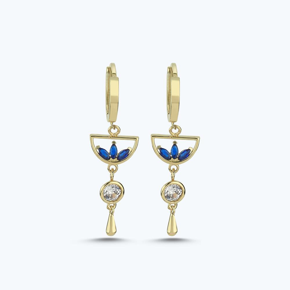 Mavi Taşlı Sallantılı Altın Halka Küpe
